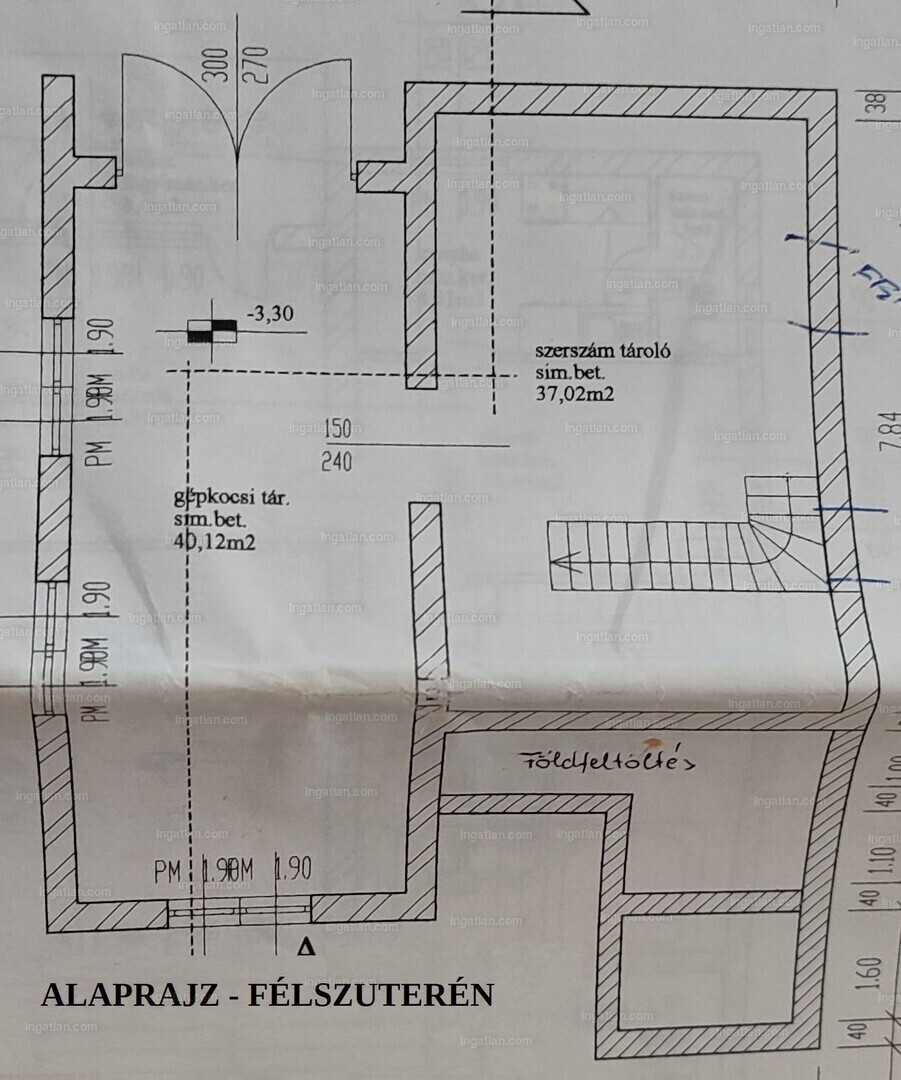 Az alsó félszuterén szinten 100m2-en 2-állásos 40m2-es garázs, 37m2-es szabadidős és gépészeti helyiség víz- és csatorna csatlakozással, valamint 2db kívülről megközelíthető 10-12 m2-es tároló található.